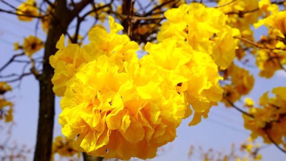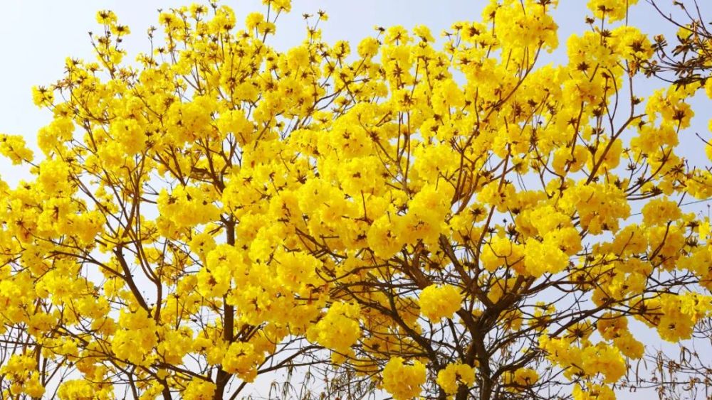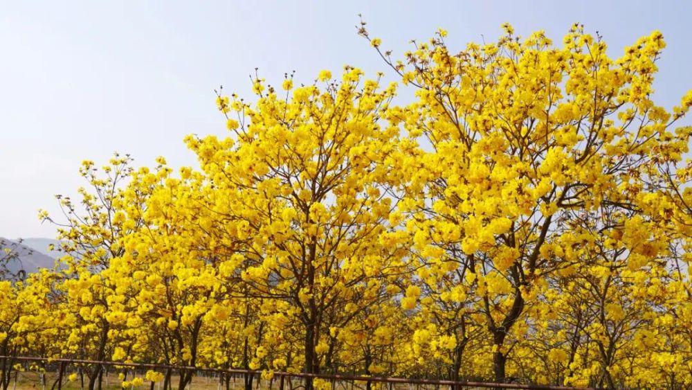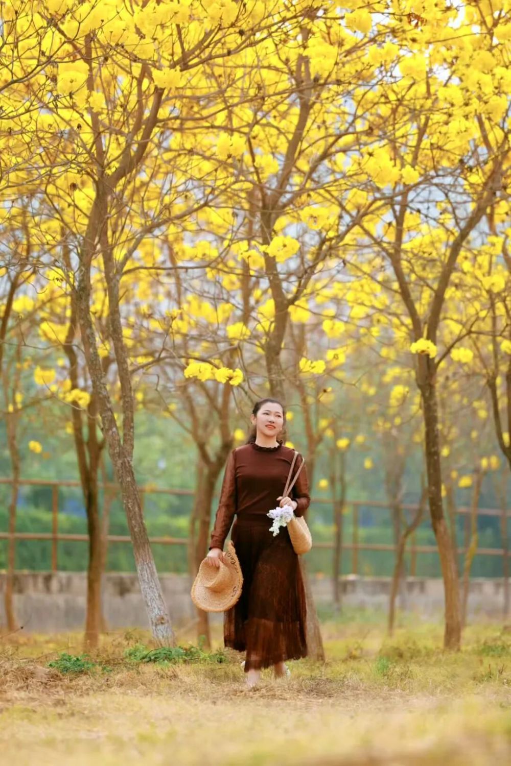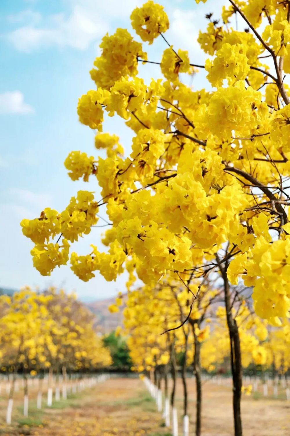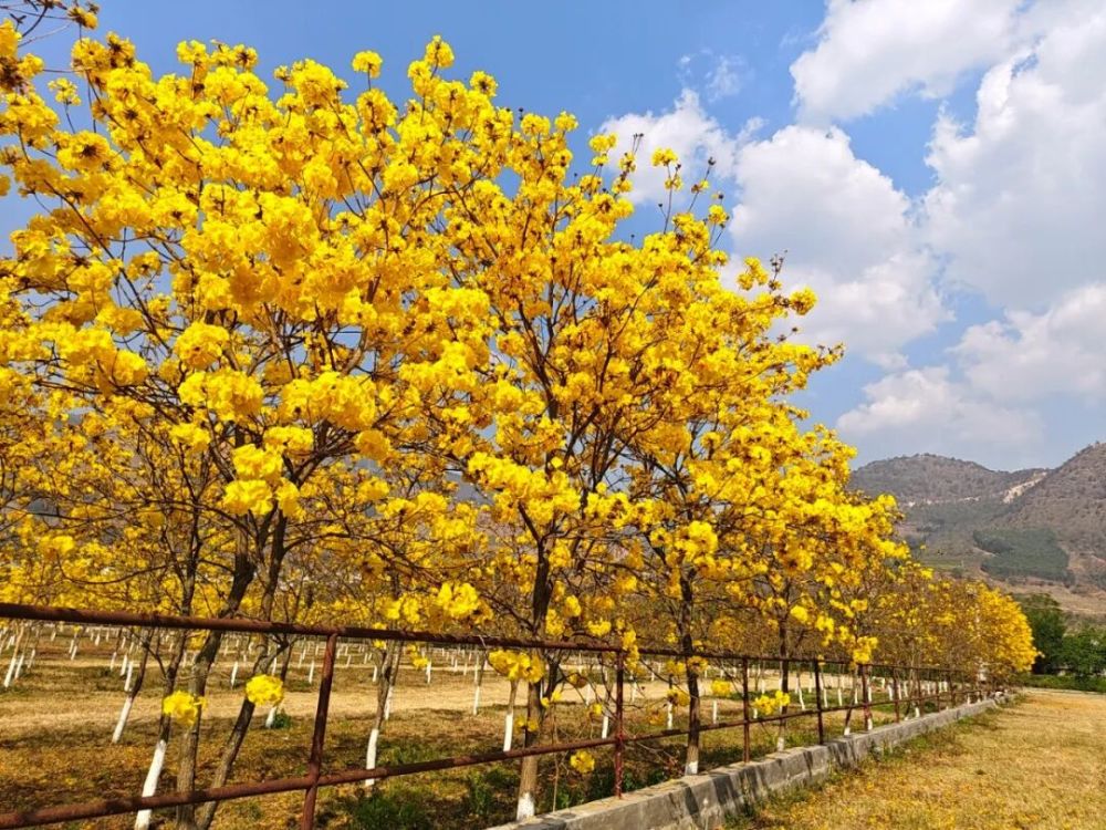 走进民族和谐广场,连片黄花风铃木沿步道与停车广场舒展生长,呈现“先花后叶”的独特景致。枝头不见片叶,漏斗状金黄花朵簇拥成团,在暖阳下流光溢彩,远观如金色云霞铺展,近看似串串风铃垂挂。微风拂过,花枝轻颤,花瓣随风飘落,铺就一地温柔,淡淡花香萦绕鼻尖,让人心旷神怡。广场与大宇斗牛场相融相依,民俗场地与自然花海相映成趣,既保留了乡土烟火气,又增添了诗意浪漫感。