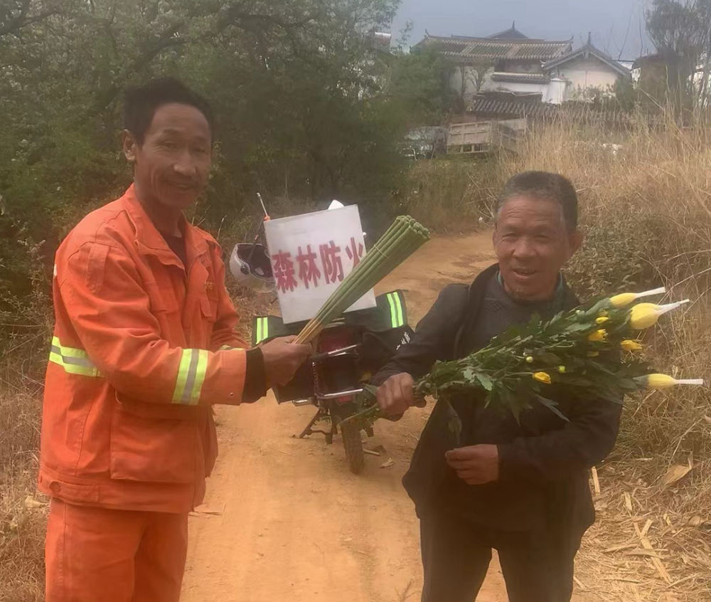 护林人员用鲜花换香火、纸钱。(市应急管理局火灾科供图)