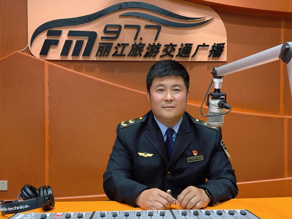3月12日,丽江市森林草原防灭火指挥部办公室工作人员、市应急管理局火灾科科长 梁国坤 走进FM97.7丽江旅游交通广播直播间。(丽江融媒记者 徐蕾 摄)