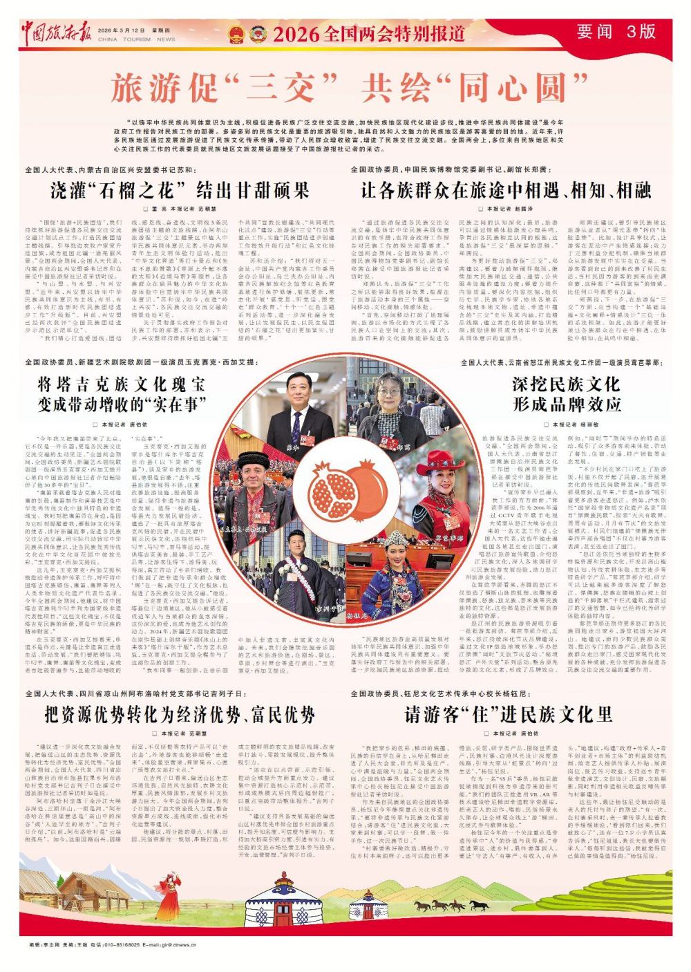 “民族地区旅游业高质量发展对铸牢中华民族共同体意识、加强中华民族共同体建设具有重要意义。要落实好政府工作报告中的相关部署,进一步挖掘民族地区旅游资源,推动旅游促进各民族交往交流交融。”全国两会期间,全国人大代表、云南省怒江傈僳族自治州民族文化工作团一级演员茸芭莘那在接受中国旅游报社记者采访时说。