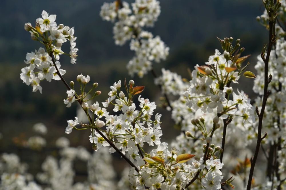 三月春城,百花竞放。昆明各地梨花次第盛开,千亩花海如雪似霜,漫山素白勾勒出诗意盎然的春日盛景,是市民和游客打造近郊游、踏青赏春的好去处。