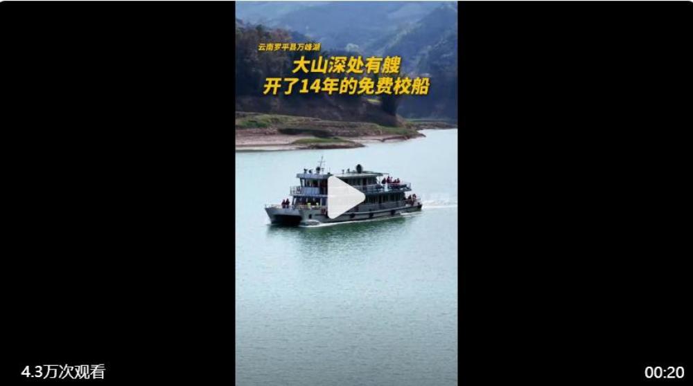 云南省罗平县的万峰湖上,有一艘开了14年的免费校船。因水电站建设,孩子们只能乘船上学。通过“大船+小船”的接驳模式,免费校船14年如一日守护上学路。