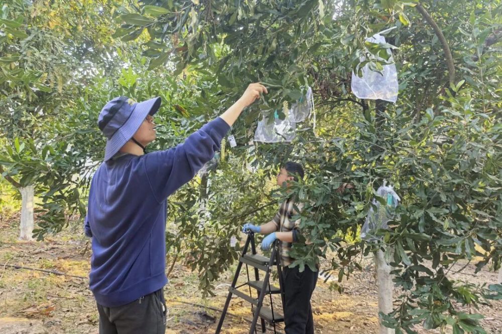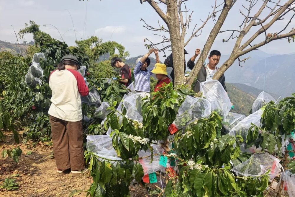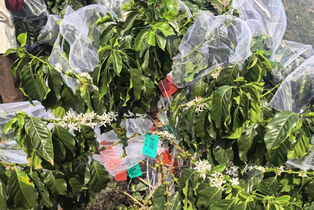 走进蚂蚁堆乡、圈内乡的千亩试验示范基地,只见部分澳洲坚果和咖啡花朵被套上了白色的隔离网袋,另一部分则挂着小小的标签牌。这是技术团队设置的标准化分组对照试验:套袋的花朵被阻断昆虫授粉,设为自然风媒对照组;经蜜蜂充分访花授粉的花朵挂牌标记,设为蜜蜂授粉实验组。