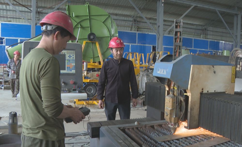 康斌(右)和同事在生产车间忙着生产雾炮机配件。(丽江融媒记者 赵丽军 摄)