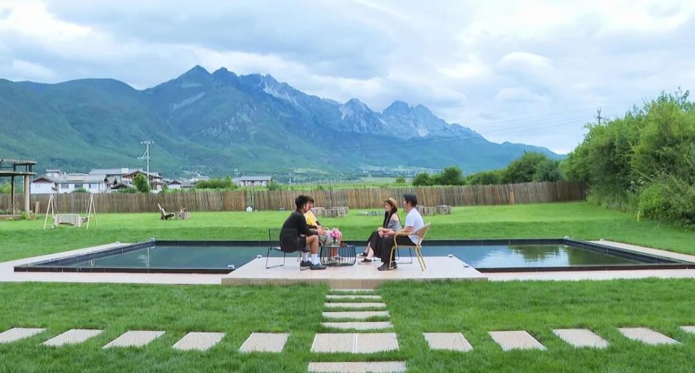 在丽江漫栖湾雪山·野奢民宿,游客围坐闲谈,悠然欣赏雪山美景。(丽江融媒记者 和继鹏 摄)