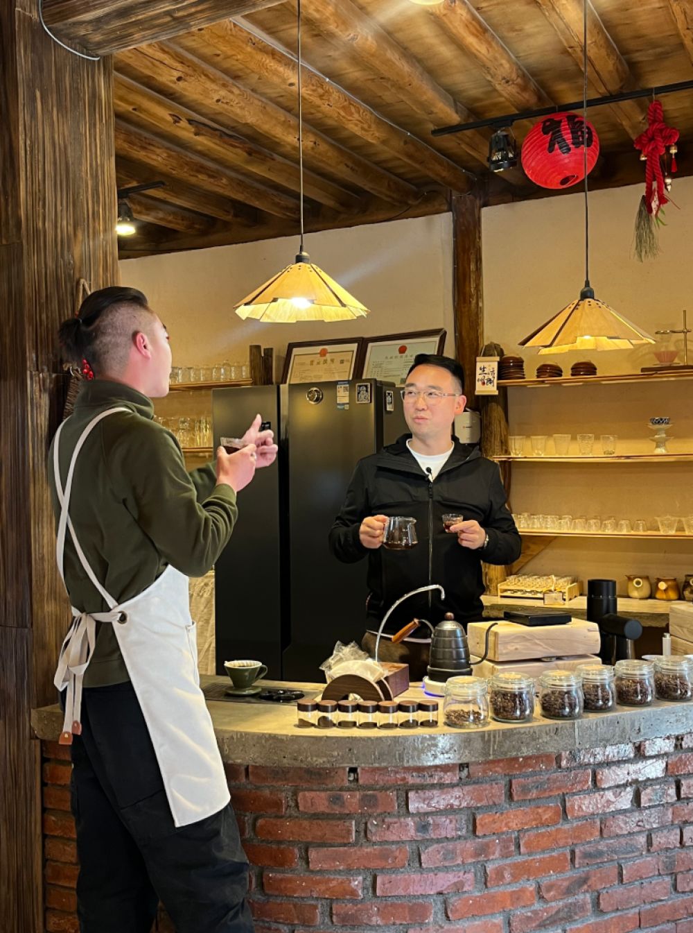 刘永乐(右)在白沙古镇的礼山冲·云南手冲咖啡店与咖啡师感受冲泡咖啡的乐趣。(丽江融媒记者 段玉菊 摄)