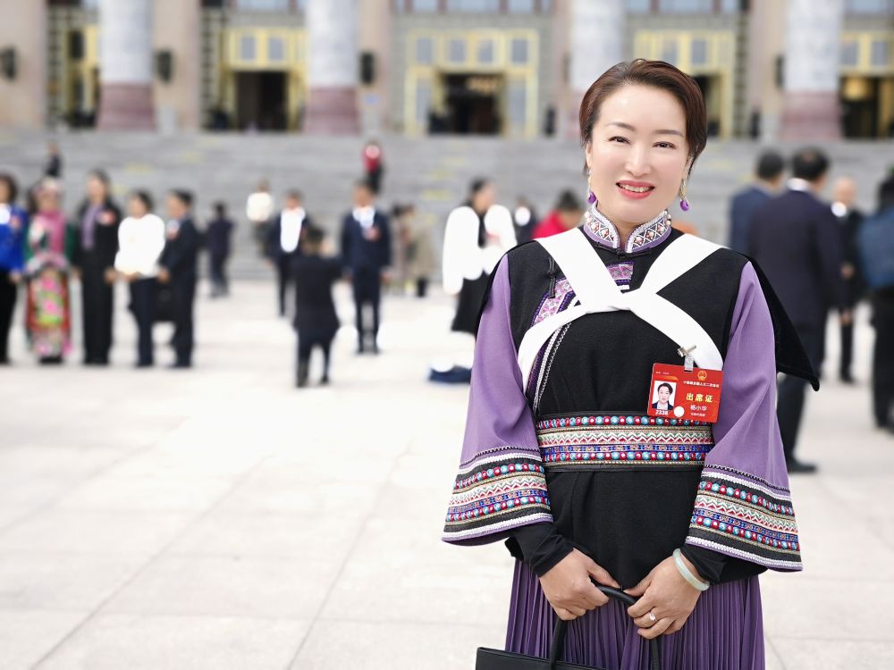 2026年两会期间,杨小华在人民大会堂前。(受访者 供图)