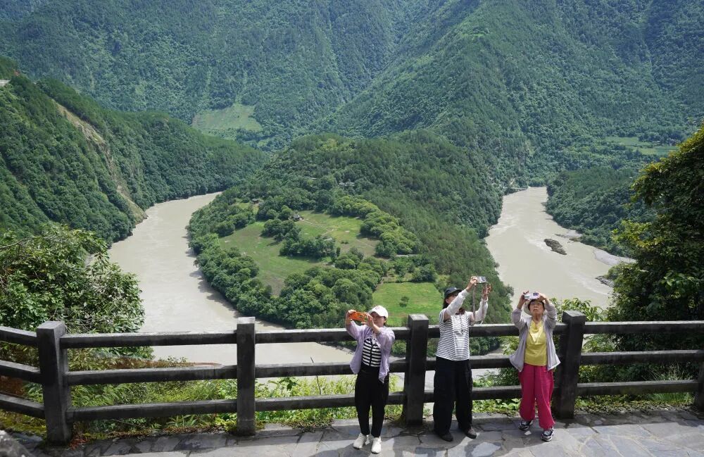 游客在云南省怒江傈僳族自治州贡山独龙族怒族自治县怒江第一湾拍照游玩(2025年7月15日摄)。新华社发(梁志强 摄)