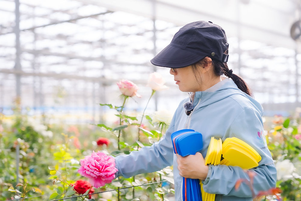 云南昆明呈贡,中午日头极盛,蔡艳飞依然穿梭在她的“减配”大棚。时而“辣手摧花”,时而插下蓝牌,从最初全是国外舶来品,到自主选育的中国苗排着长队等待入棚,“宝华”、“文秀”、“娇龙”等网红月季新品种名收获了十亿级的阅读量、百万级的评论,蔡艳飞和团队为鲜切花品种端突围闯出了一条从跨界到破圈的新路。