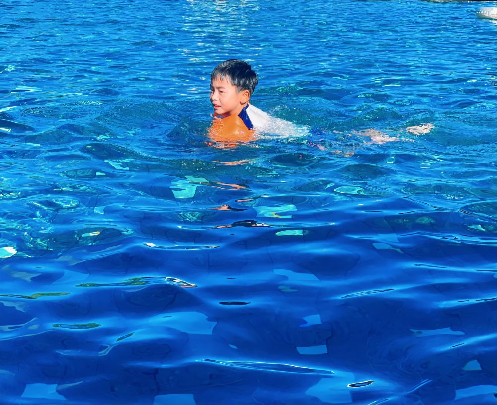 阿婆坐在池边的藤椅上,藏青色的头巾裹着花白的鬓角,手里攥着半块没吃完的米花糖。她的目光追着泳池里扑腾的小孙子,眼角的皱纹里盛着细碎的笑意。“慢点儿,别呛着!” 她的声音裹着阳光的暖意,飘在湿热的风里。小孙子戴着明黄色的泳圈,两条细腿在水里蹬得飞快,溅起的水花打湿了阿婆的裤脚。她却只是笑着用袖口擦了擦,把米花糖往嘴里送一口,甜香混着硫磺温泉的气息,弥漫在空气里。