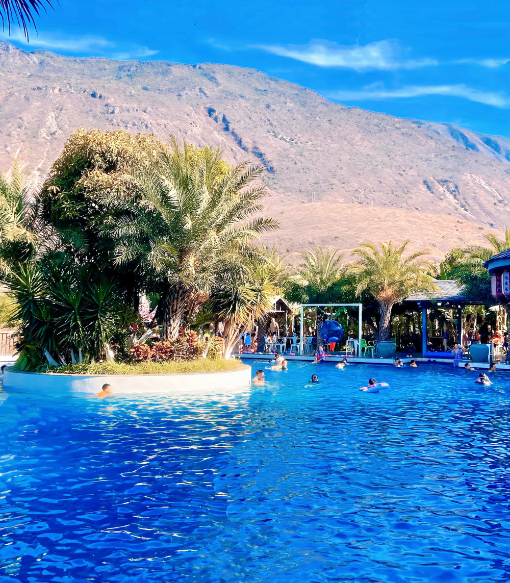 远处的山峦在澄澈的蓝天下晕染出淡淡的轮廓,与江边的棕榈树、泳池里的欢声笑语,共同勾勒出一幅鲜活又松弛的度假画卷。