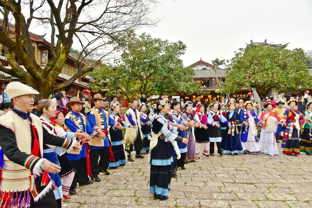 市民穿着民族服饰在丽江古城载歌载舞。(丽江融媒记者 李琳 摄)