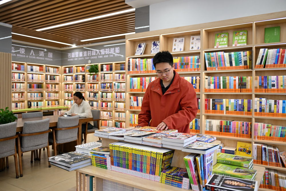 2025年3月25日,居民在雄安新区容西片区贤溪社区XIN空间公益图书馆挑选书籍。