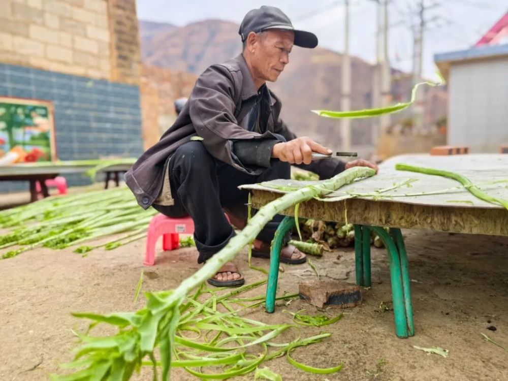 在片角镇红光村,傈僳族群众李有才一家正在采收贡菜。将贡菜从田地里采割回家,然后经过削皮、加工成均匀、细长的菜条,然后经过晾晒,加工成鲜绿的菜条,成千上万根菜条在微风中摇曳,蔚为壮观。