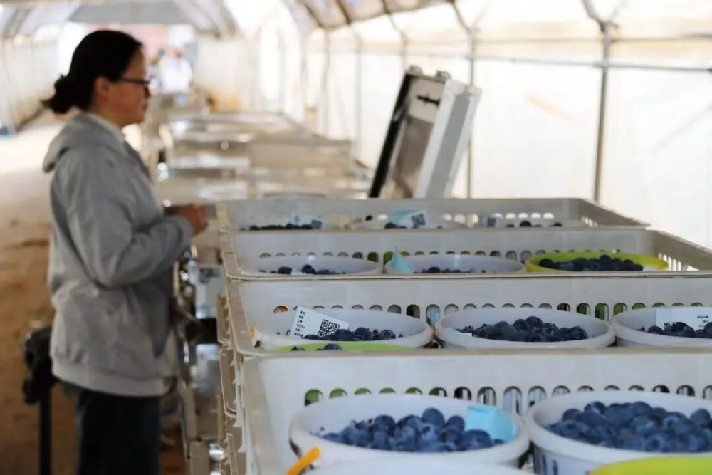 据了解,2024年4月,方郎村委会引进设施蓝莓种植项目,经过大半年的精心筹备与科学培育,2025年2月,该基地第一批蓝莓顺利上市,年产值达1.2亿元,交出了亮眼的产业答卷。相较于传统露地种植,设施蓝莓采用基质标准化栽培、大棚精准控温及数字化智能管理模式,不仅单株采摘量可达3公斤至5公斤,更有效拉长采摘周期、稳定果品品质,实现错峰上市、优质优价,大幅提升了产业经济效益。