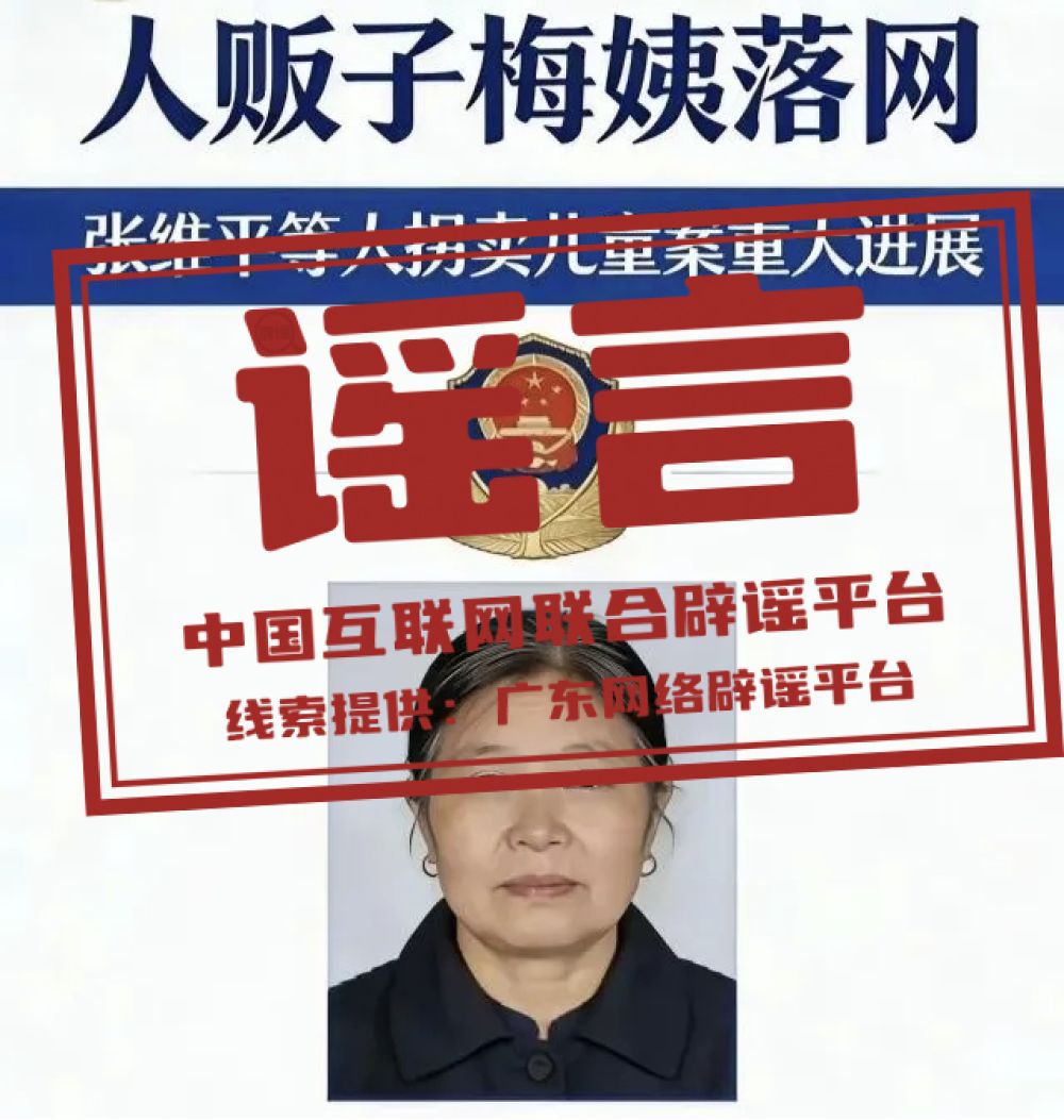 详情:近日,广州警方宣布“张维平拐卖儿童案”关键人物“梅姨”(谢某某)落网。不久后,一张标有警徽、配着所谓落网“梅姨”照片的图片在网络流传。经核查,该网传图片并非警方发布,所谓的“梅姨”照片为虚假照片。