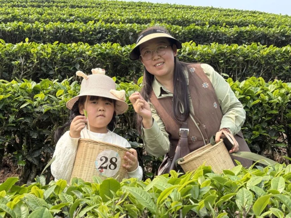 游客化身 “临时茶农”,感受春日采茶的田园乐趣。