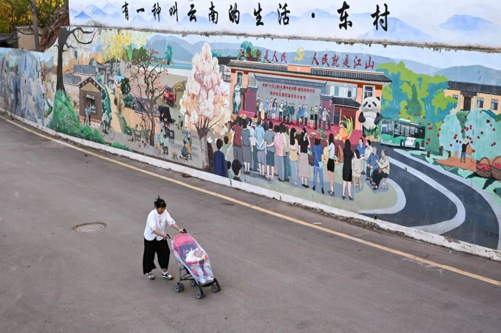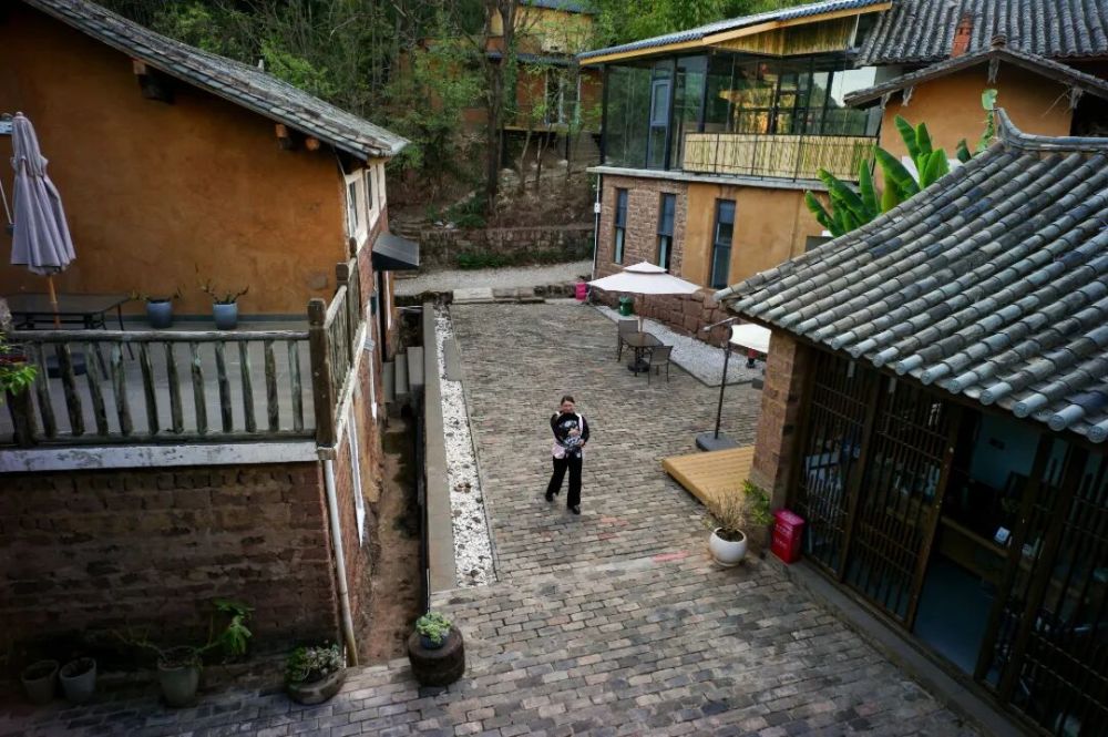 在东村社区的一家由旧民居改造的民宿,民宿管家蒋梅抱着孩子散步。
