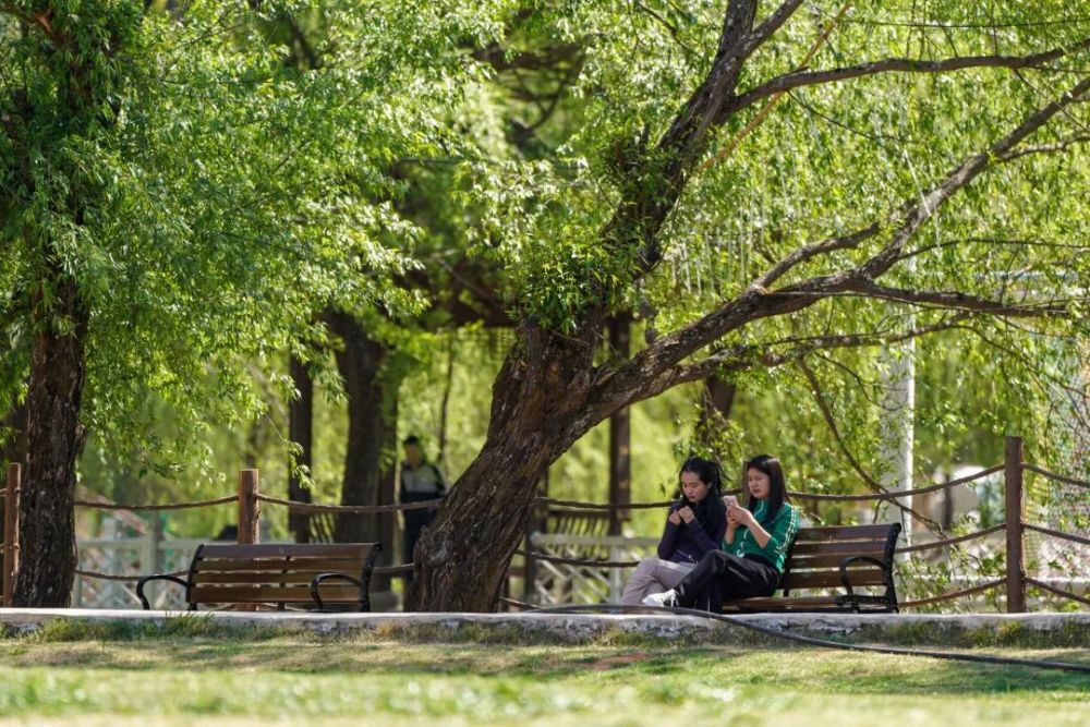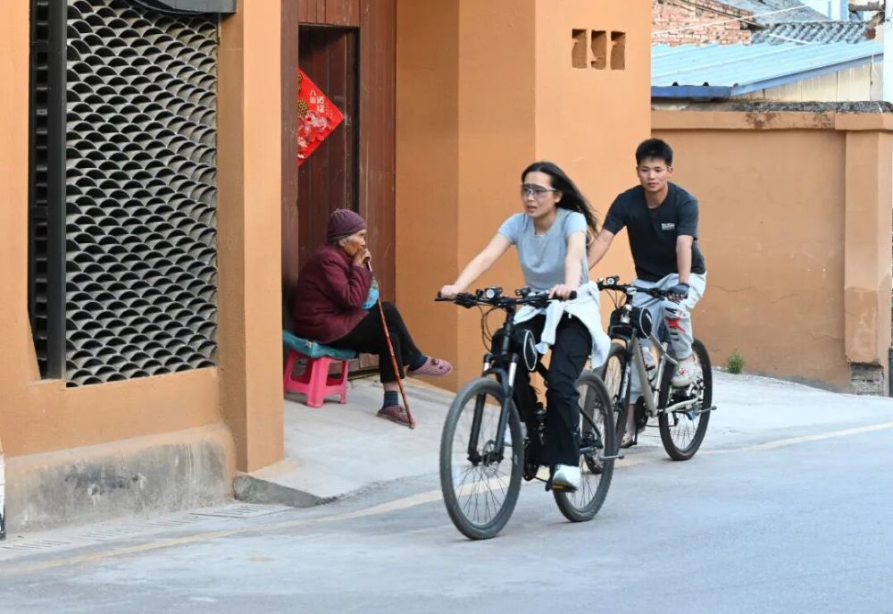 东村社区87岁的孙保华老人坐在家门口休息,两名游客骑自行车从她家门口经过。