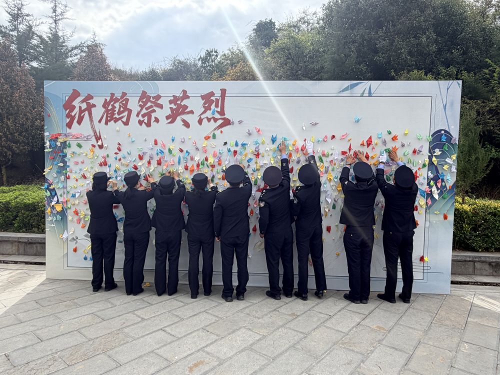 为倡导绿色文明祭扫,烈士陵园全域严禁焚烧纸钱、燃放鞭炮,大力推行鲜花祭扫,并创新设置“纸鹤祭英烈”互动环节,参与者可将手写寄语的纸鹤粘贴于主题展板,以文明环保的方式寄托哀思、缅怀先烈。