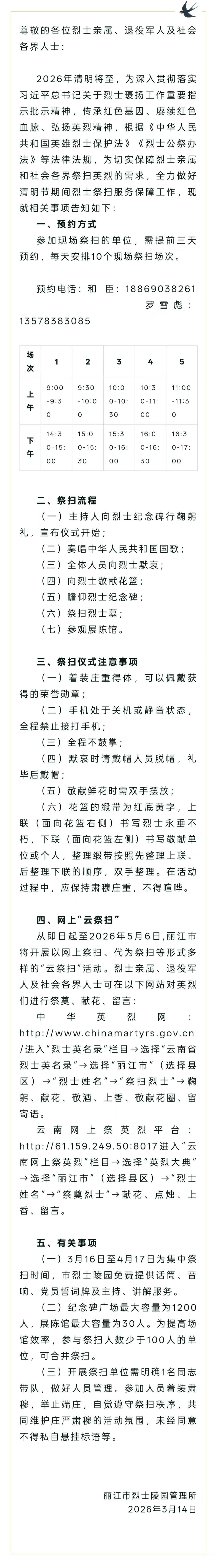 今年清明期间,烈士陵园实行分类预约祭扫服务,团体可通过“丽江市退役军人事务局”微信公众号或拨打咨询电话0888-5167888提前3天预约,分时错峰入园;个人祭扫无需预约,现场登记即可入园。3月31日至4月6日为祭扫高峰期,烈士陵园开放时间调整为8:00—18:00。其间,烈士陵园将常态化提供英烈事迹讲解服务,并开通云祭扫、代祭扫渠道,方便异地群众寄托哀思。
