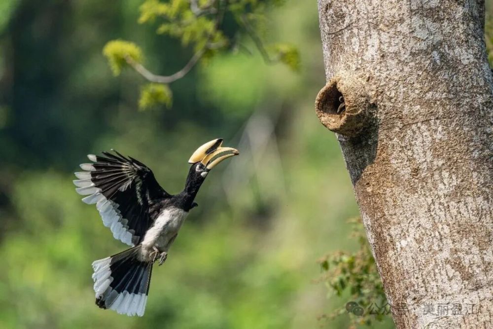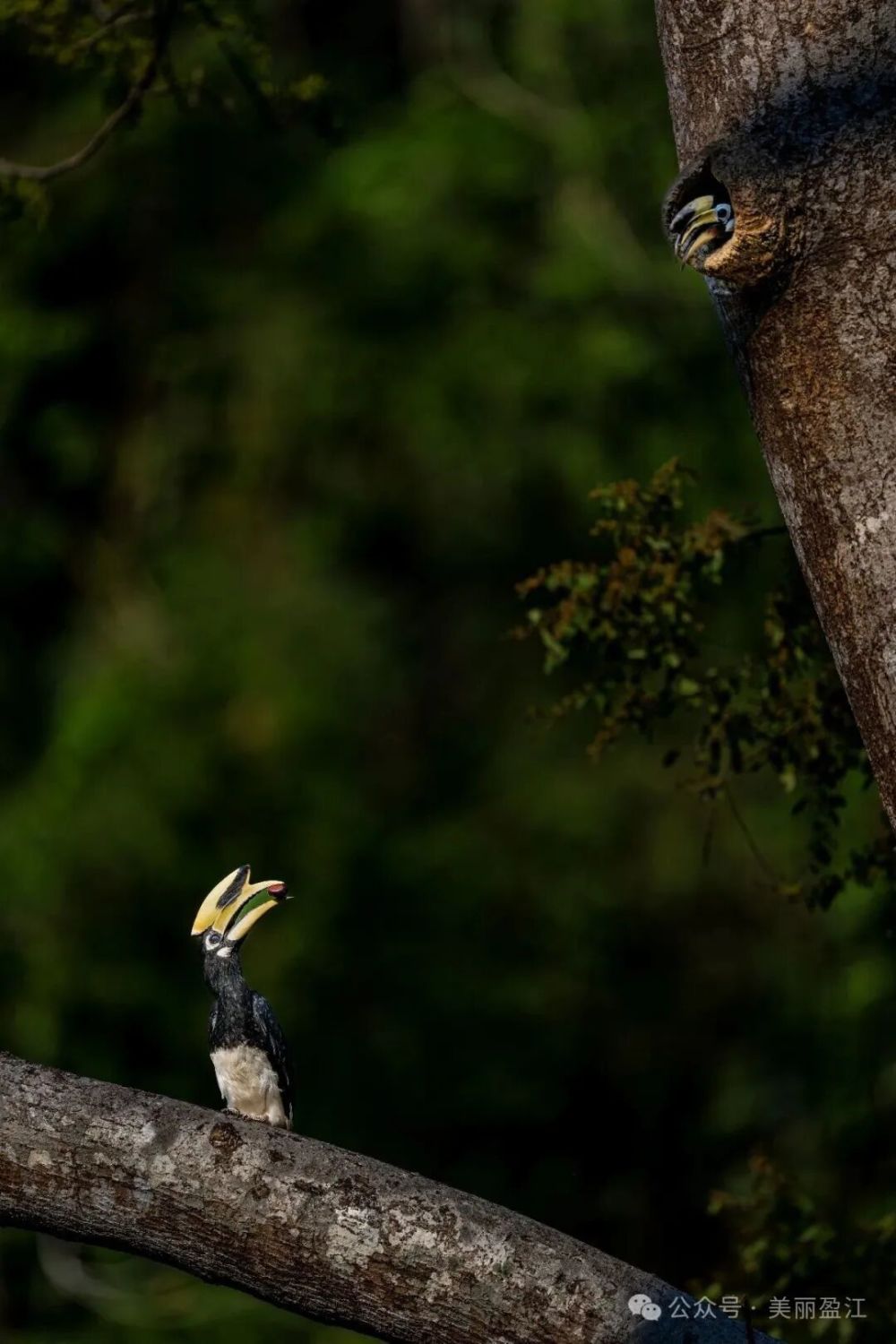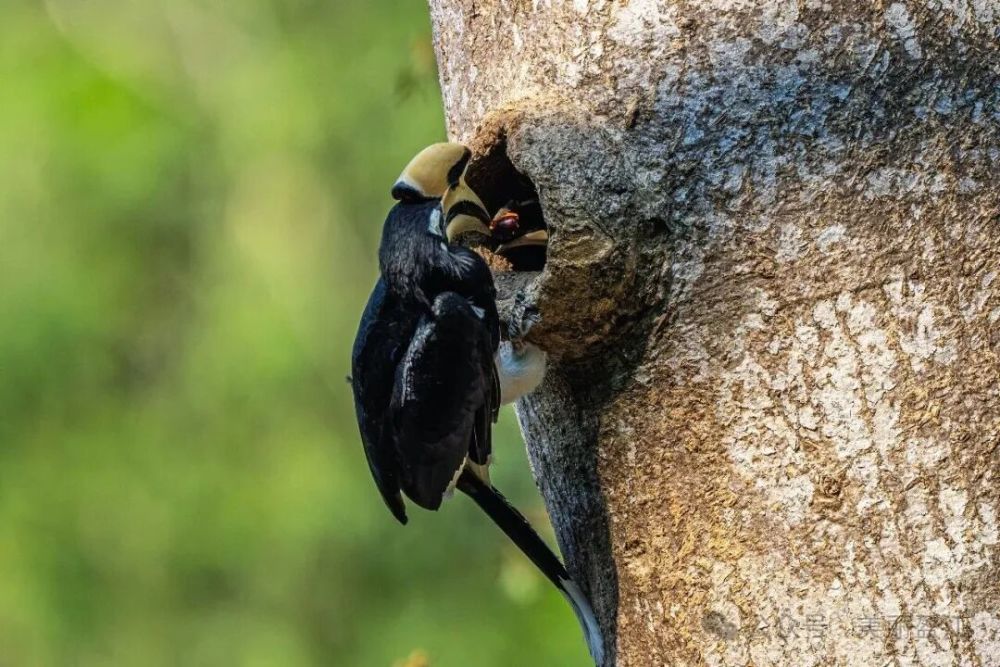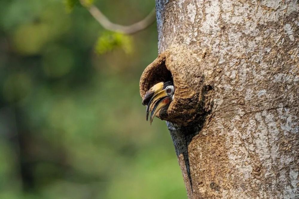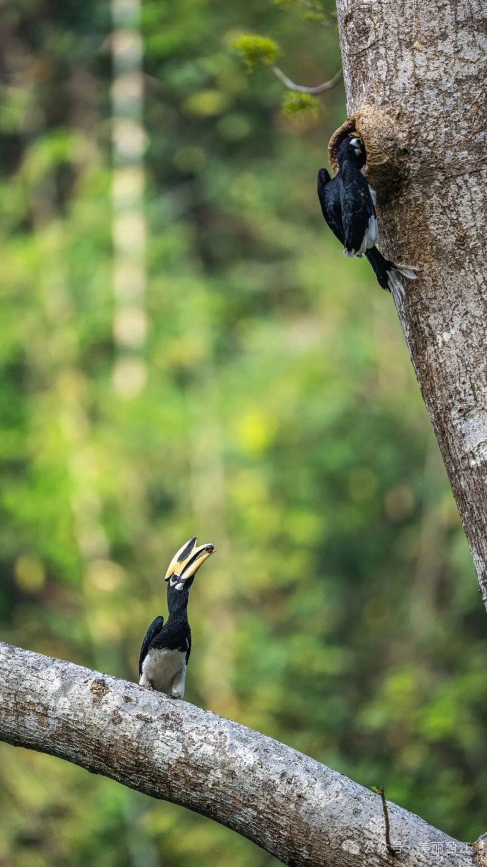 在固定的巢洞育雏是犀鸟特殊的行为,由于犀鸟体形较大,对巢洞的要求非常高,不仅需要巢洞空间足够宽敞,还需要周边有足够的食物供应,所以它们基本只在植被丰富、古木参天的原始雨林里生存。我国共有五种犀鸟,它们都是国家一级重点保护野生动物,“中国犀鸟谷”是目前国内唯一稳定有三种犀鸟分布及繁殖的区域,盈江县也是目前我国唯一同时有五种犀鸟分布的地区。