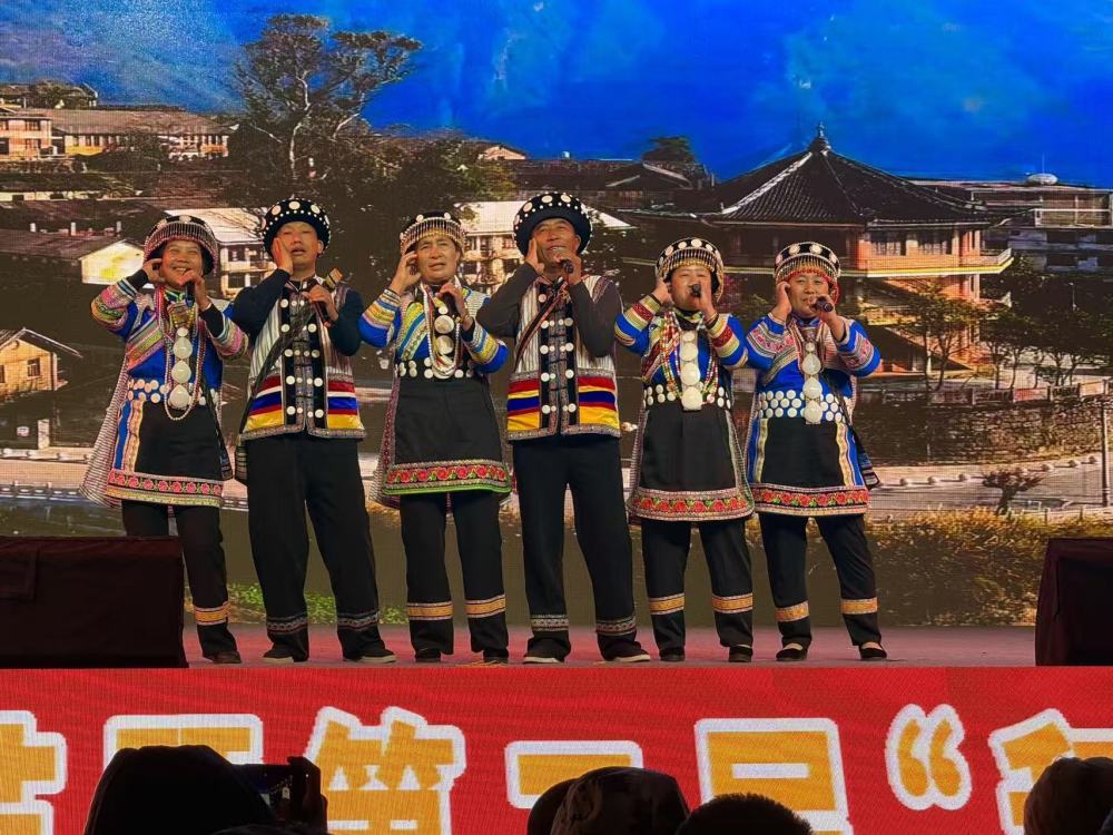 怒江州级非物质文化遗产代表性传承人祝兴三(右三)携团队带来非遗表演。(丽江融媒记者 张丽瑶 摄)
