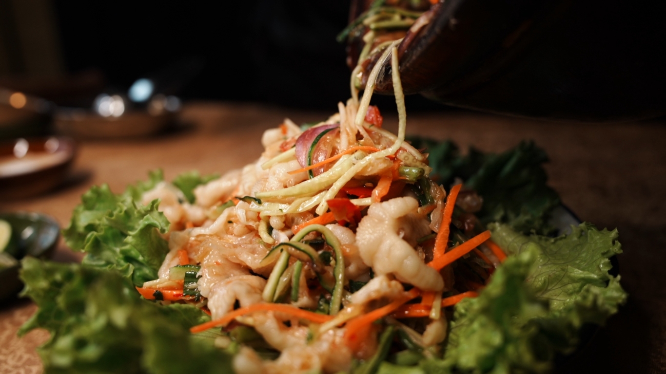 酸辣开胃,Q弹爽脆!新鲜鸡脚去骨后,与小米辣、柠檬、香菜等香料一起舂拌,每一口都吸满傣味灵魂酱汁,酸得过瘾、辣得开胃,越啃越香。