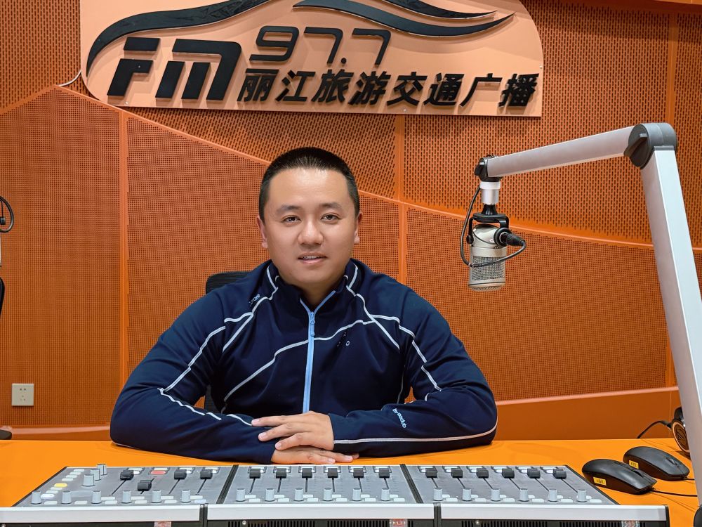 4月7日,古城区西安街道寨后社区区委委员 刘政廷 走进FM97.7丽江旅游交通广播直播间。(丽江融媒记者 徐蕾摄)