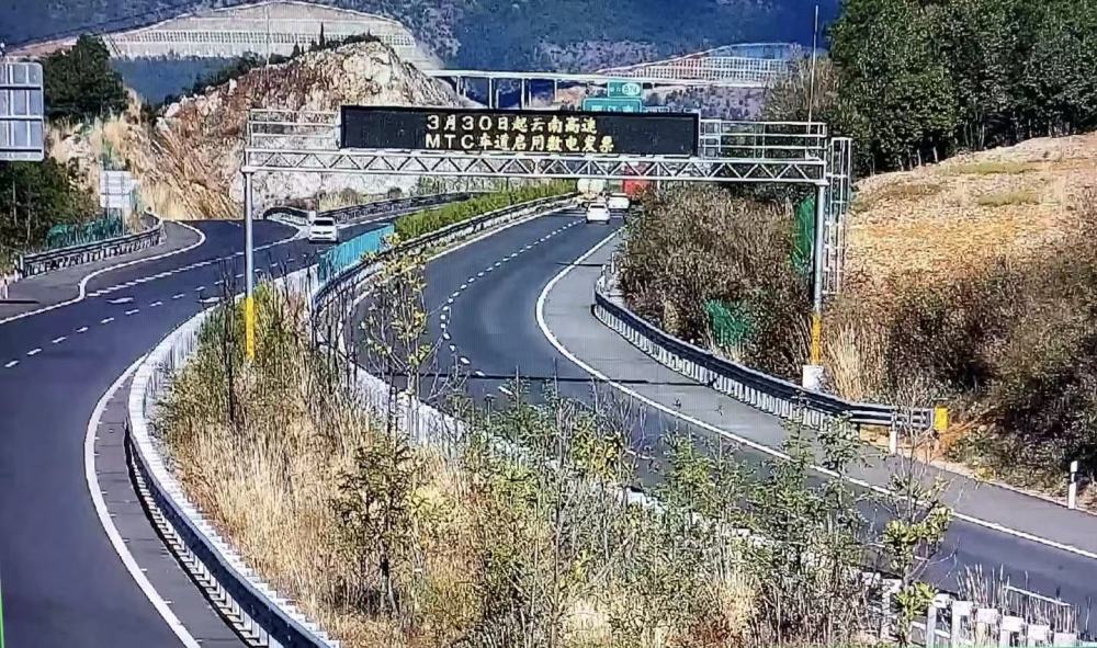 华丽高速沿线情报板提示云南高速MTC车道启用数电发票。(华丽高速公司监控截图)