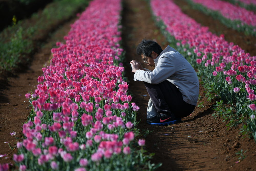 摄影师专注拍摄郁金香。(丽江融媒记者 赵庆祖 摄)