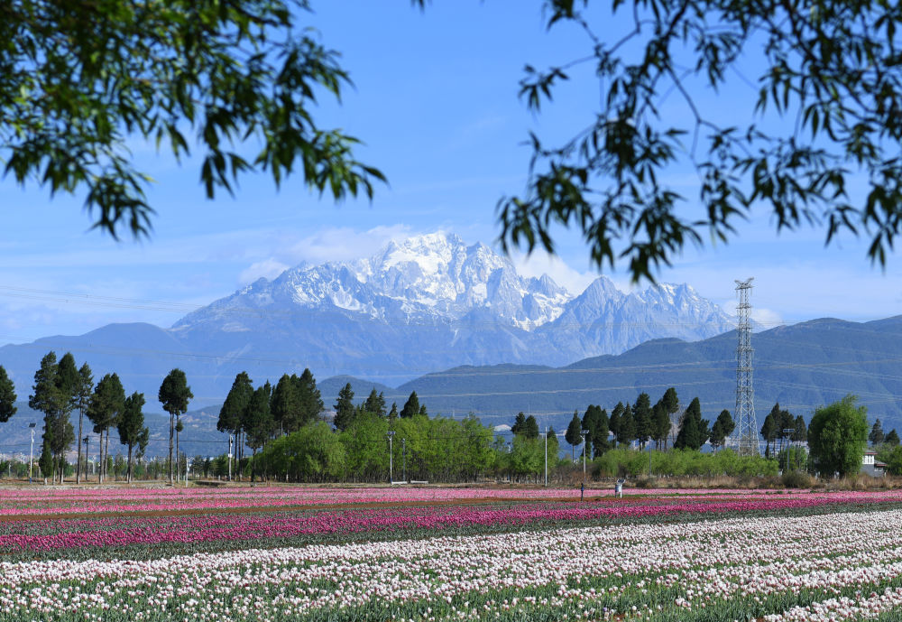 盛放的郁金香与玉龙雪山同框。(丽江融媒记者 赵庆祖 摄)