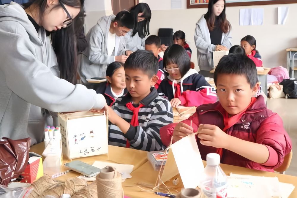 艺宁服务团成员正教学生做手工。(供图)