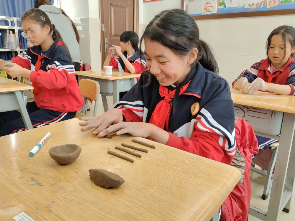 在特色融合课程《指尖上的陶泥》课堂上,志愿者将东巴象形文字等非遗引入志愿项目,让孩子们在“玩泥巴”中感知文化魅力。