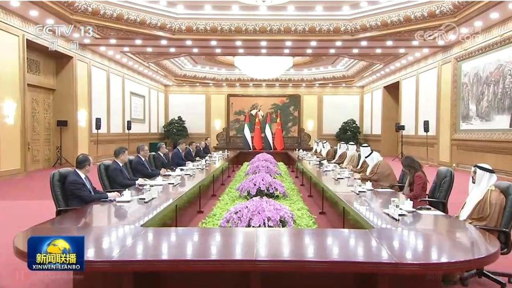 习近平指出,阿联酋是中国的全面战略伙伴,中方始终高度重视发展同阿联酋的关系。在双方共同努力下,中阿关系保持健康稳定发展,政治互信不断加深,务实合作稳步推进,人文交流丰富多彩。巩固和提升中阿关系是双方的坚定共识,符合两国人民期待。中方愿同阿方携手同行,打造更加稳固坚韧、富有活力的中阿全面战略伙伴关系。双方要继续在涉及彼此核心利益和重大关切问题上相互支持,保持高层交往,筑牢战略互信。加强发展战略对接,在能源、投资、贸易、科技等领域深挖潜力,深化互利合作。推动教育、民航、旅游等合作取得更大进展,密切人文交流,夯实民意基础。在联合国、金砖国家等多边平台增进协调合作,以中阿关系的稳定性应对国际和地区形势的不确定性,共同推动构建人类命运共同体。