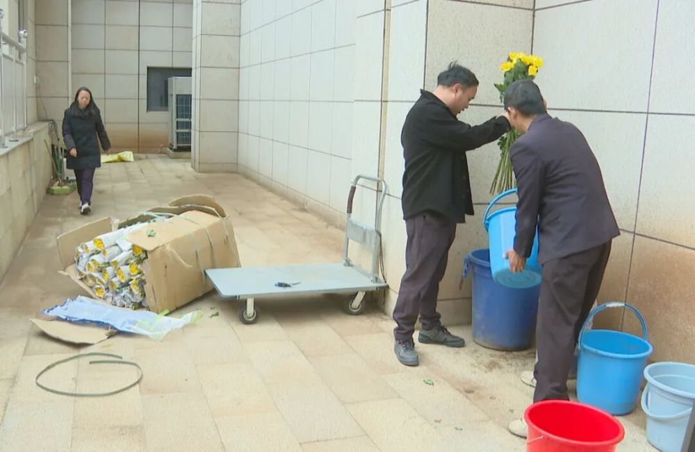 古城区团山艺术陵园工作人员在准备免费赠送市民的菊花。 (丽江融媒记者 张丽瑶 摄)