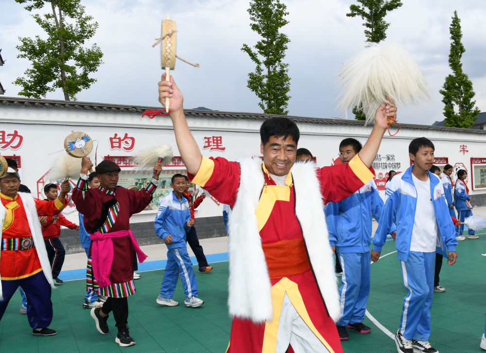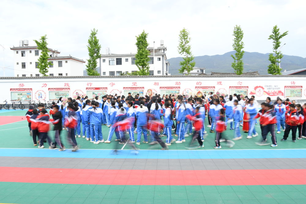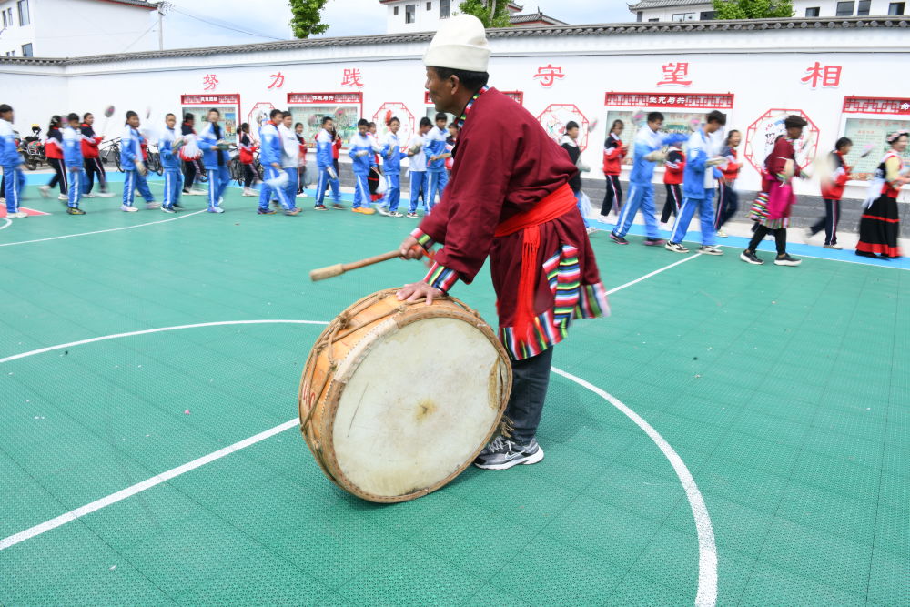 4月20日,勒巴舞走进古城区民族中学。(丽江融媒记者 赵庆祖 摄)