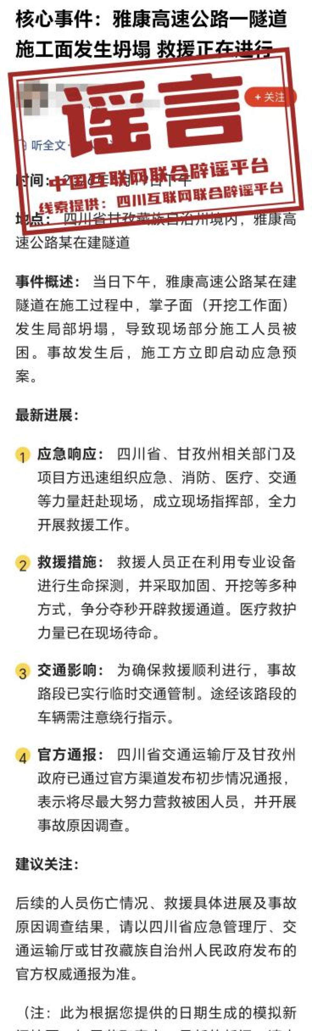 对此,属地应急部门回应未接到相关救援工作。属地交通部门回应,经全面核查,雅康高速在建隧道施工正常,未发生垮塌事故,更没有施工人员被困,网传消息系凭空捏造,纯属造谣。经进一步核查发现,网传“雅康高速公路一隧道施工面发生坍塌”音频及文字系AI生成的模拟新闻摘要。(来源:四川互联网举报辟谣平台、网视甘孜)