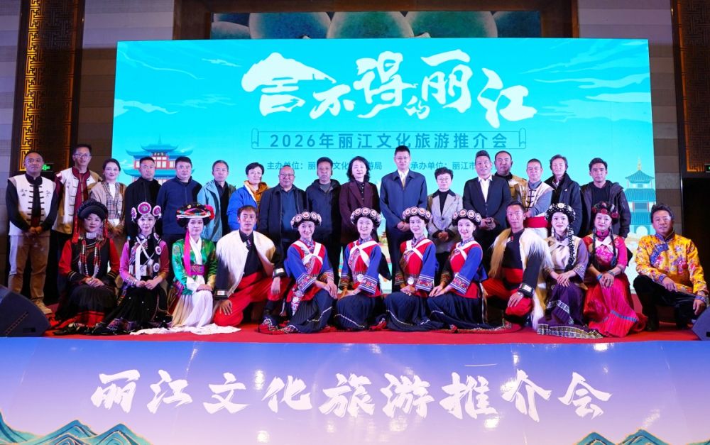 与会嘉宾与丽江文旅推介人员合影。(丽江融媒记者 李扬 摄)
