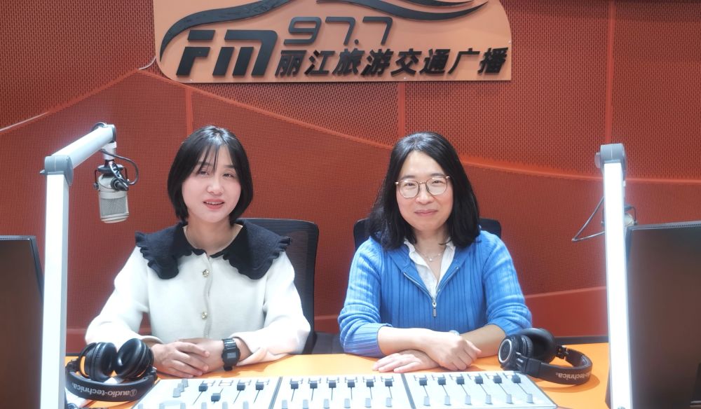 4月24日,丽江师范学院图书馆资源建设科科长付凤岐(右)、丽江师范学院文传学院专任教师、青年诗人刘宁(左)做客丽江旅游交通广播。(丽江融媒记者 李婧 摄)