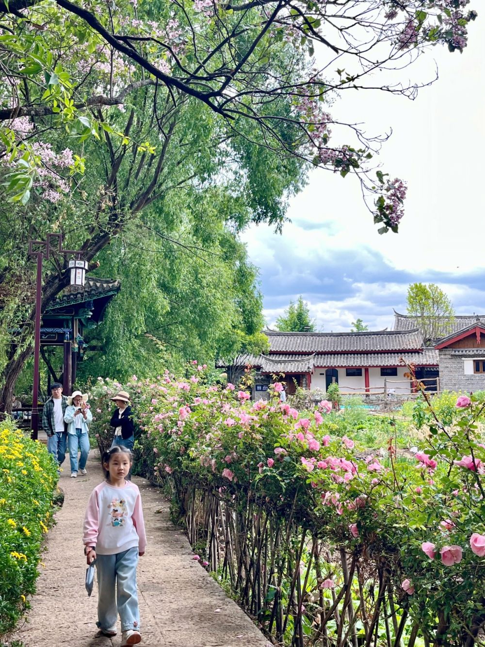游客漫步在蔷薇花开的小径上。(丽江融媒记者 和慧芳 摄)
