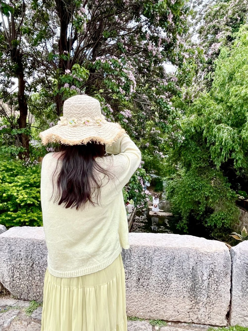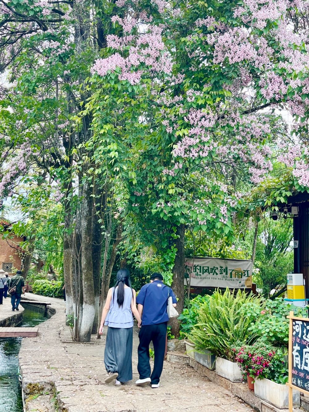 青龙河从玉龙雪山脚下蜿蜒而来,穿镇而过,把两岸的楸木花、古柳青瓦、石板老桥景致串联。河水清澈见底,水草在水底悠悠摇曳。水岸边,高大的楸木正值花期,粉紫色的花朵缀满枝头,枝干苍劲,树冠探出青瓦飞檐。繁花沿着流水一路盛开,不喧不闹,将春日的绚烂尽数融入这方天地。沿途总能遇到一些写生或拍照的年轻游客,束河古镇已然成为旅人休闲观光的绝佳去处。