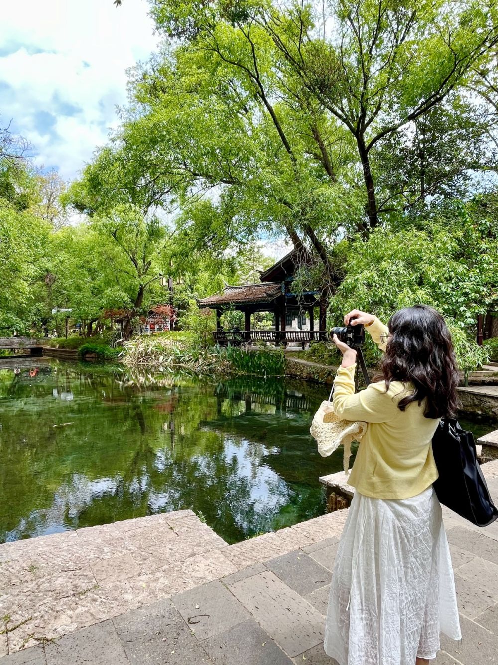 游客在绿意盎然的水岸边拍照。(丽江融媒记者 和慧芳 摄)