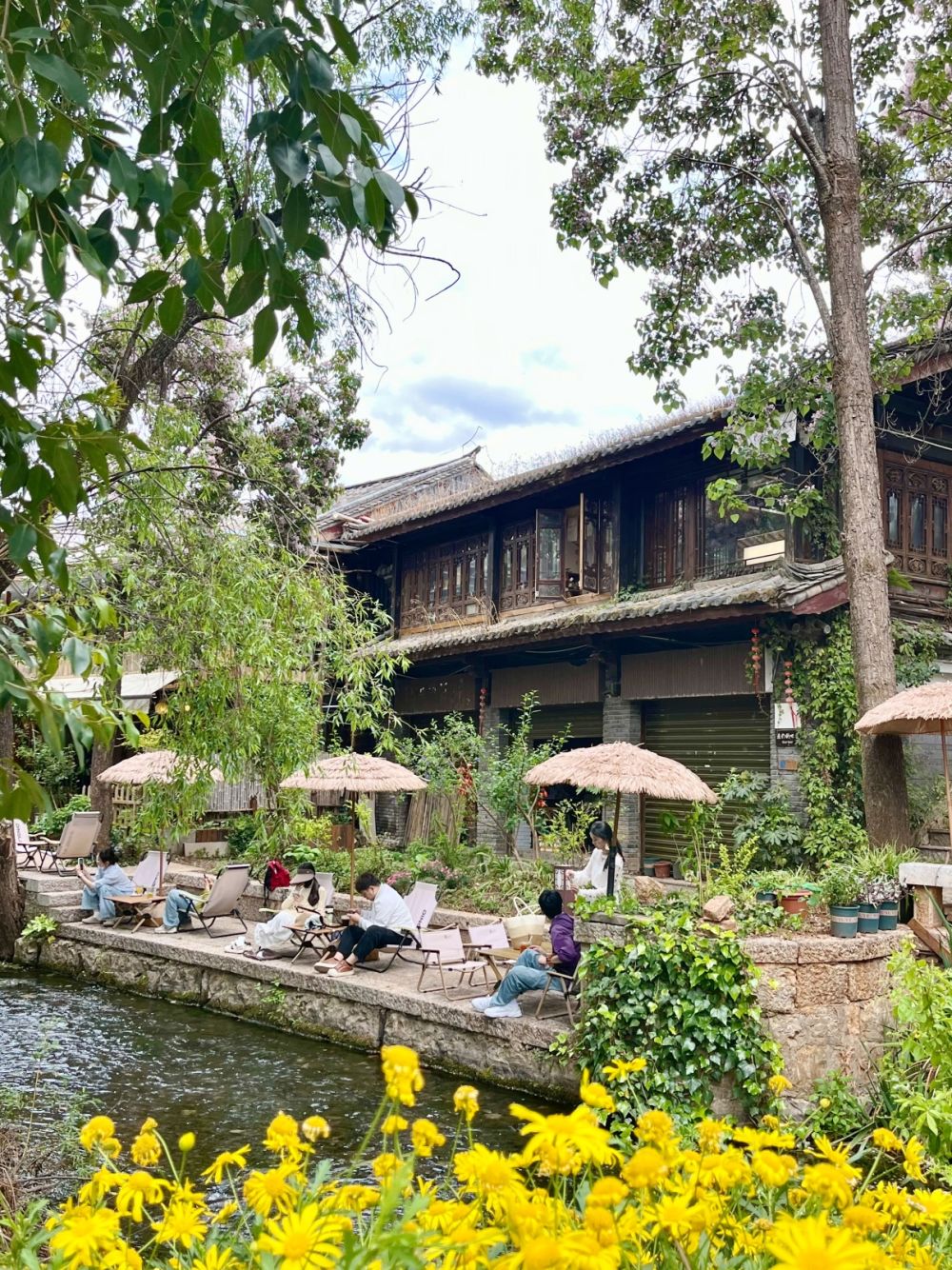 束河古镇内临水的咖啡馆里,游客在休憩。(丽江融媒记者 和慧芳 摄)