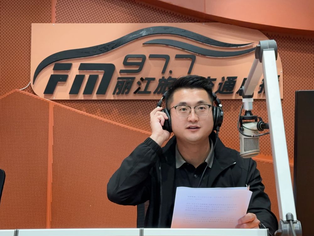 4月29日,古城区文化和旅游局党组成员、副局长杨金山做客FM97.7丽江旅游交通广播直播间。(丽江融媒记者 杨超 摄)