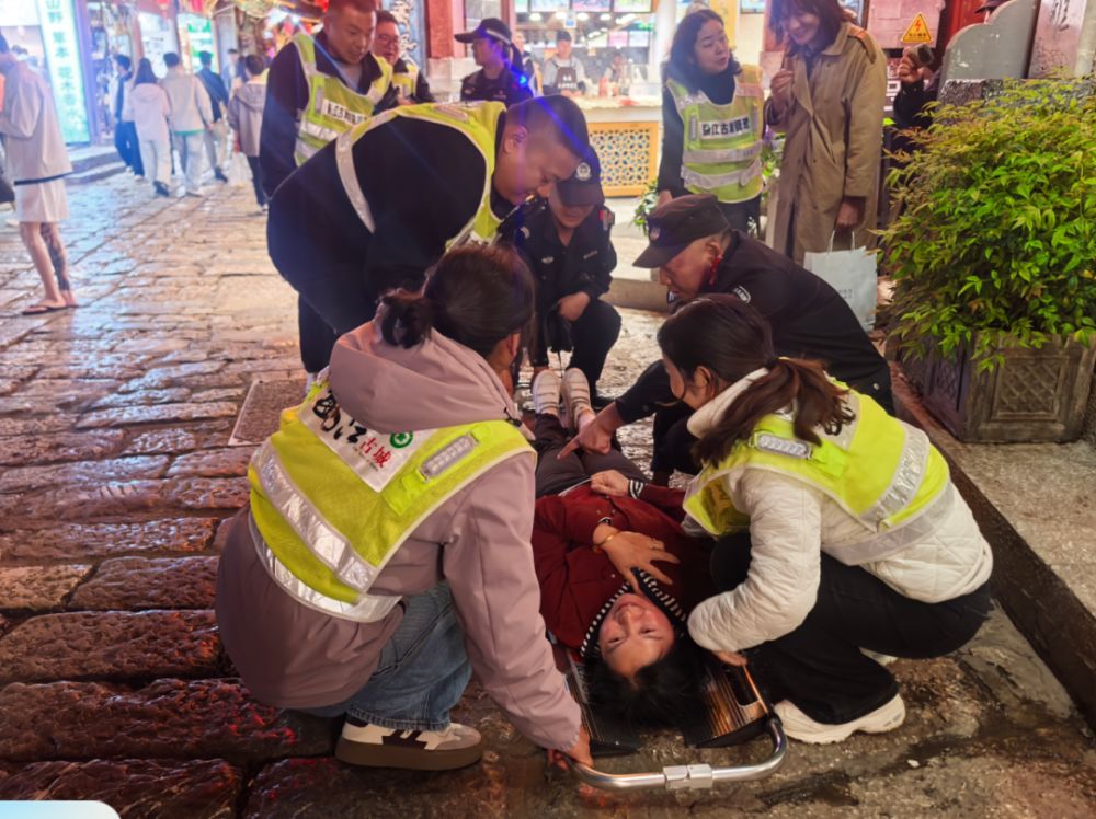 模拟演练客流高峰时段,游客在大石桥不慎摔倒,工作人员多方协作,立即响应,快速处置。(丽江融媒记者 秦文静 摄)