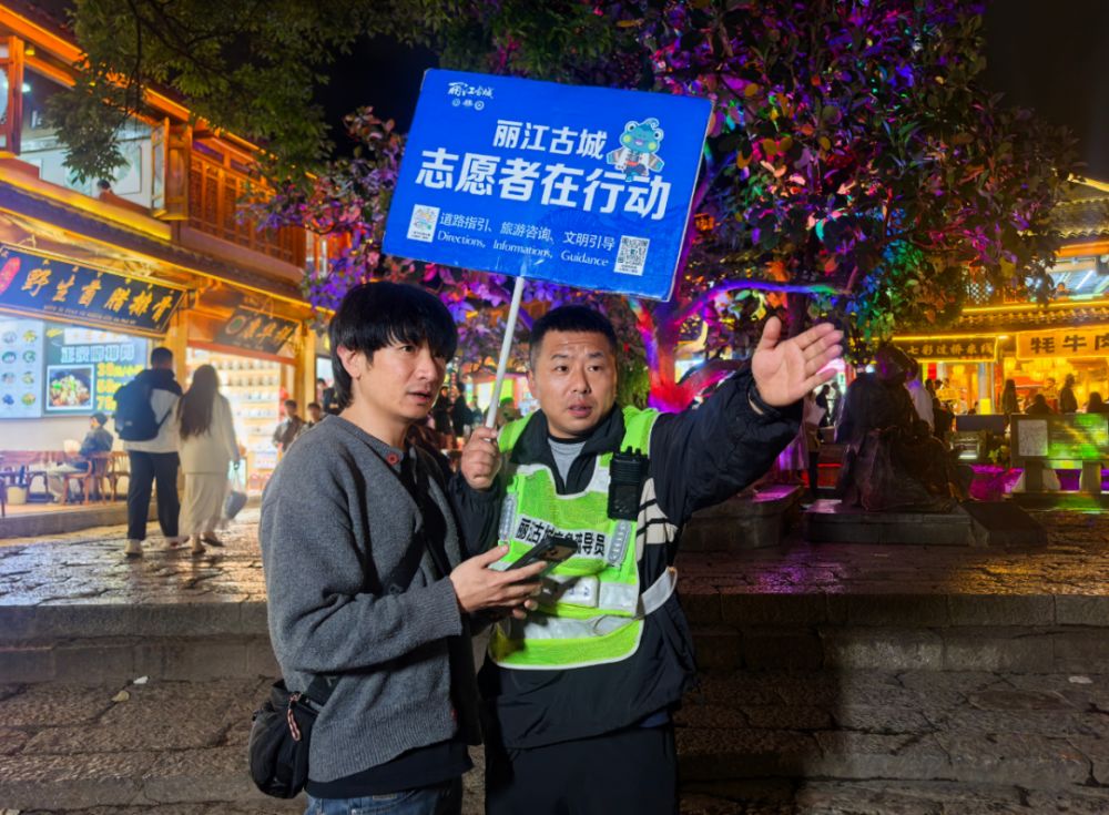 丽江古城景区志愿者为游客指路。(丽江融媒记者 秦文静 摄)