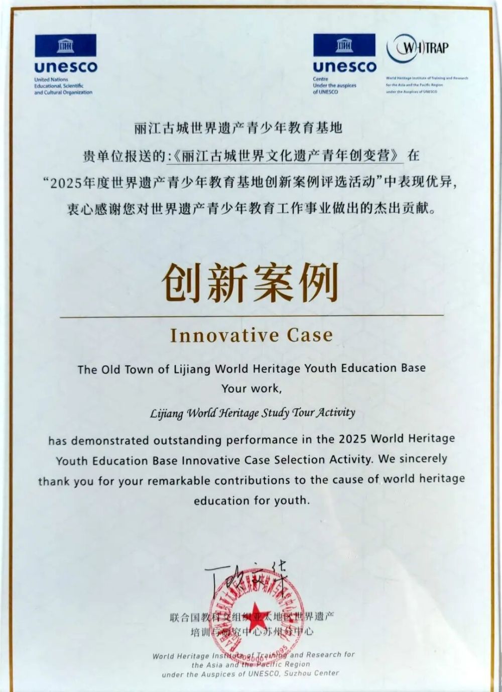 其中,丽江古城世界遗产青少年教育基地报送的“丽江古城世界文化遗产青年创变营”案例,从全国众多申报项目中脱颖而出,成功入选“2025年度世界遗产青少年教育基地创新案例”,该案例在会议期间进行专题展示。丽江古城受邀参加了本次会议,在会上领取了由联合国教科文组织亚太地区世界遗产培训与研究中心苏州分中心颁发的创新案例证书,并作案例分享。