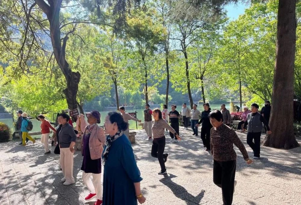 黑龙潭公园内,碧波荡漾,岸柳依依,玉龙雪山倒影清晰可见。清晨,市民在这里打太极、散步、健身,阳光透过枝叶,勾勒出一派悠然闲适的景象。“在家门口就能观雪山、享绿意,呼吸新鲜空气,真的很惬意。”76岁的市民和万青,经常在黑龙潭公园晨练,真切感受到生态带来的幸福。