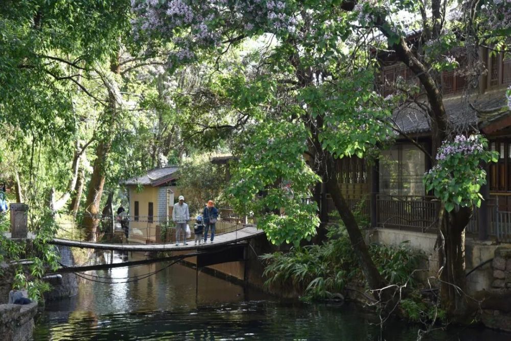 走进束河古镇,纳西古民居掩映在绿树繁花间,清澈的青龙河水静静流淌,岸边楸树花迎风绽放。游客临溪休憩,孩童在桥上嬉笑,游人与绿意相映成趣。“这里绿意浓、环境好,一步一景,太舒心了。”浙江游客陈女士边走边拍,对束河古镇生态景致赞不绝口。